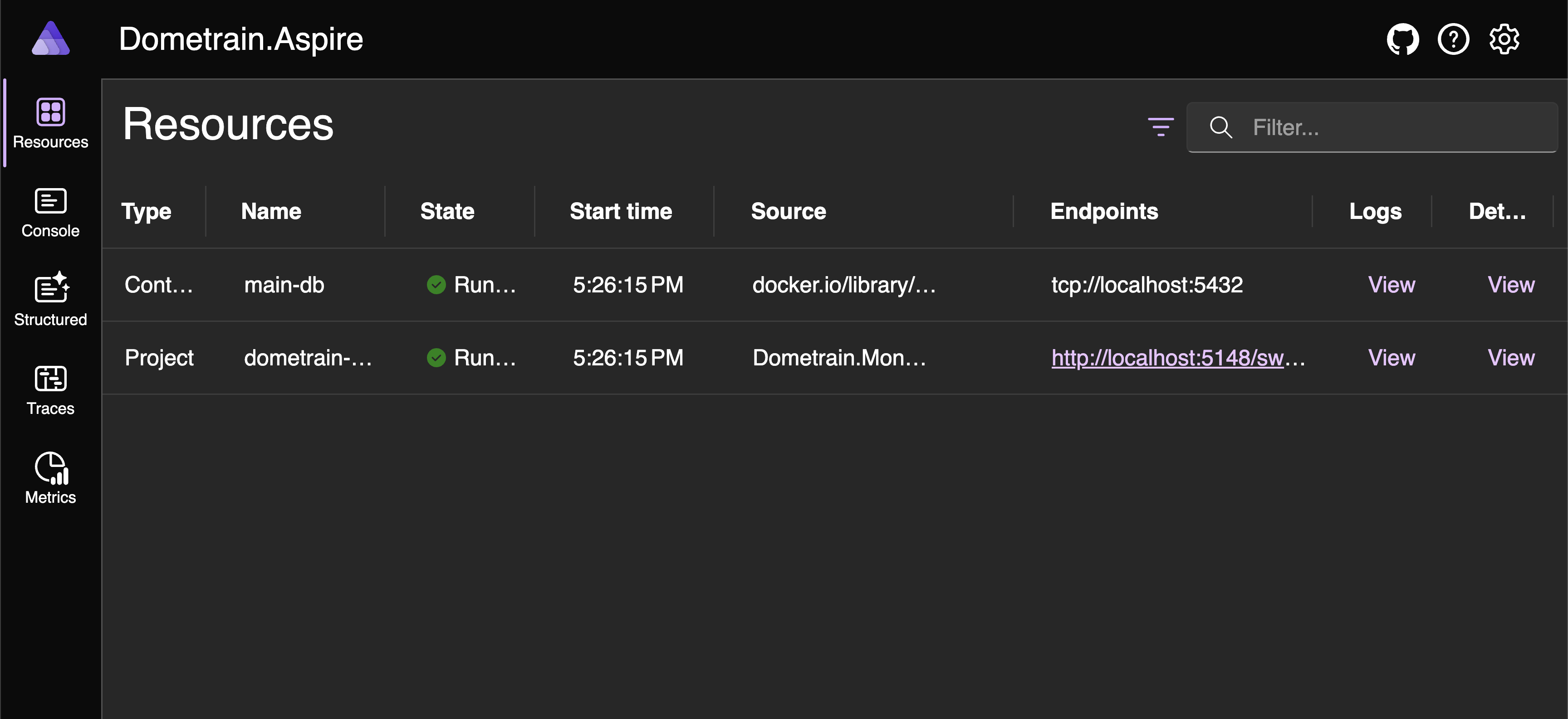 builder.AddProject<Projects.Dometrain_Monolith_Api>("dometrain-api")